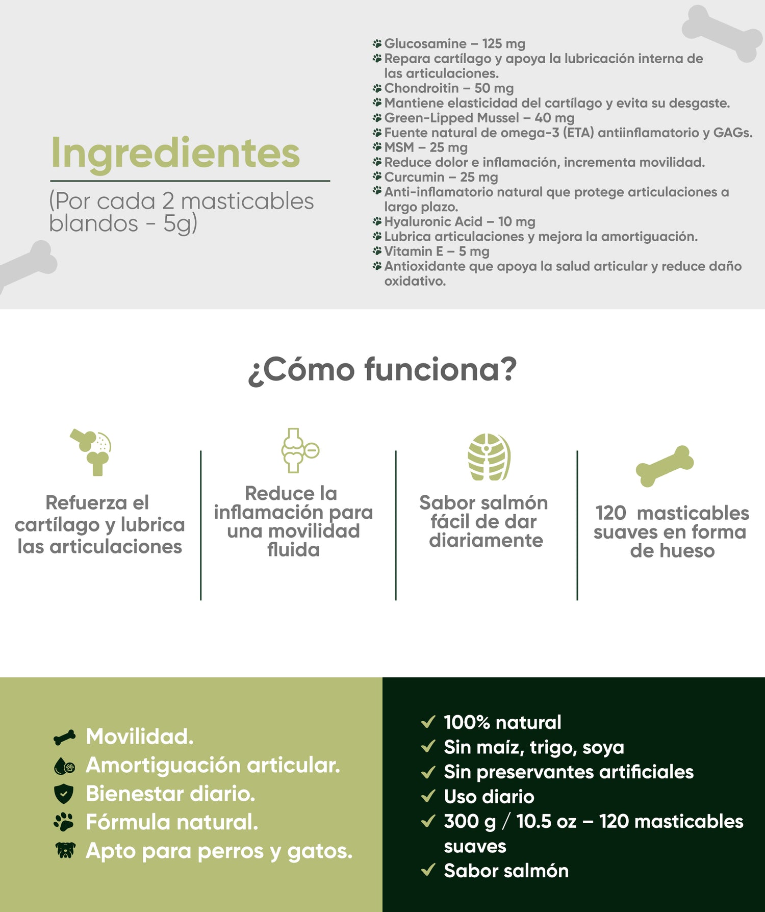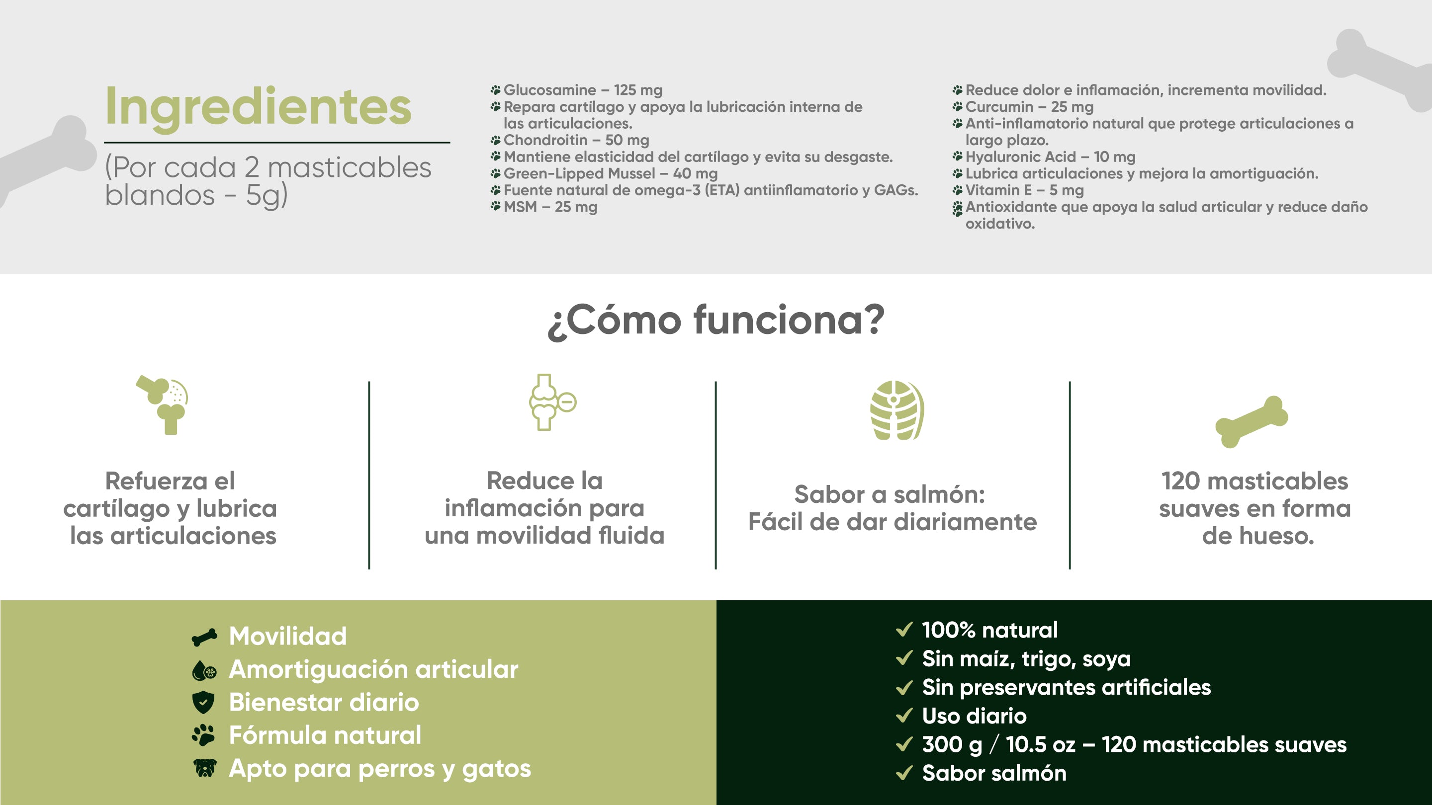 Estimula la reparación del cartílago y aumenta la producción de líquido sinovial para reducir la fricción ósea.