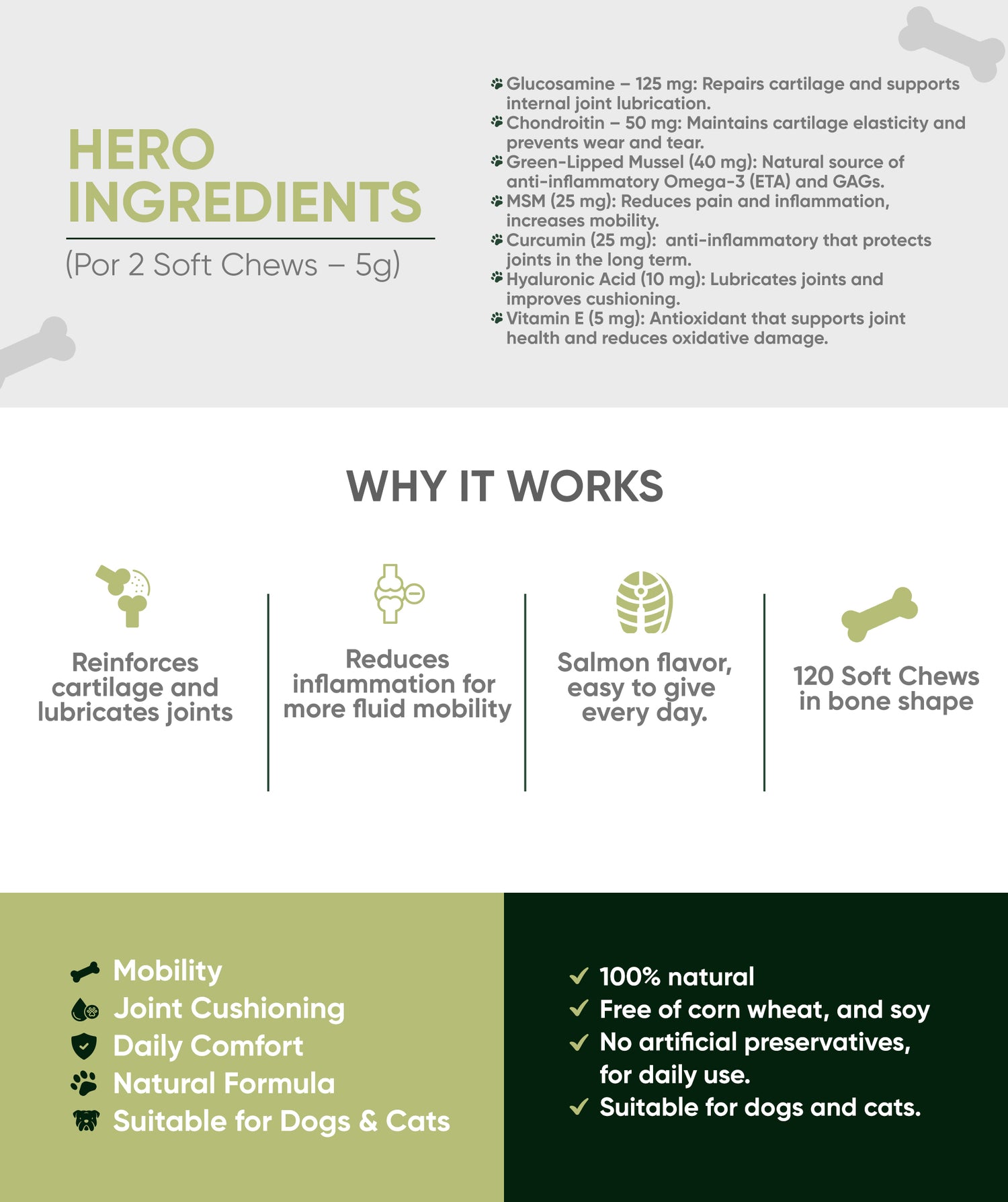 Our soft chews combine high-quality ingredients that help maintain joint flexibility, comfort, and movement, allowing dogs to stay active and enjoy everyday activities.